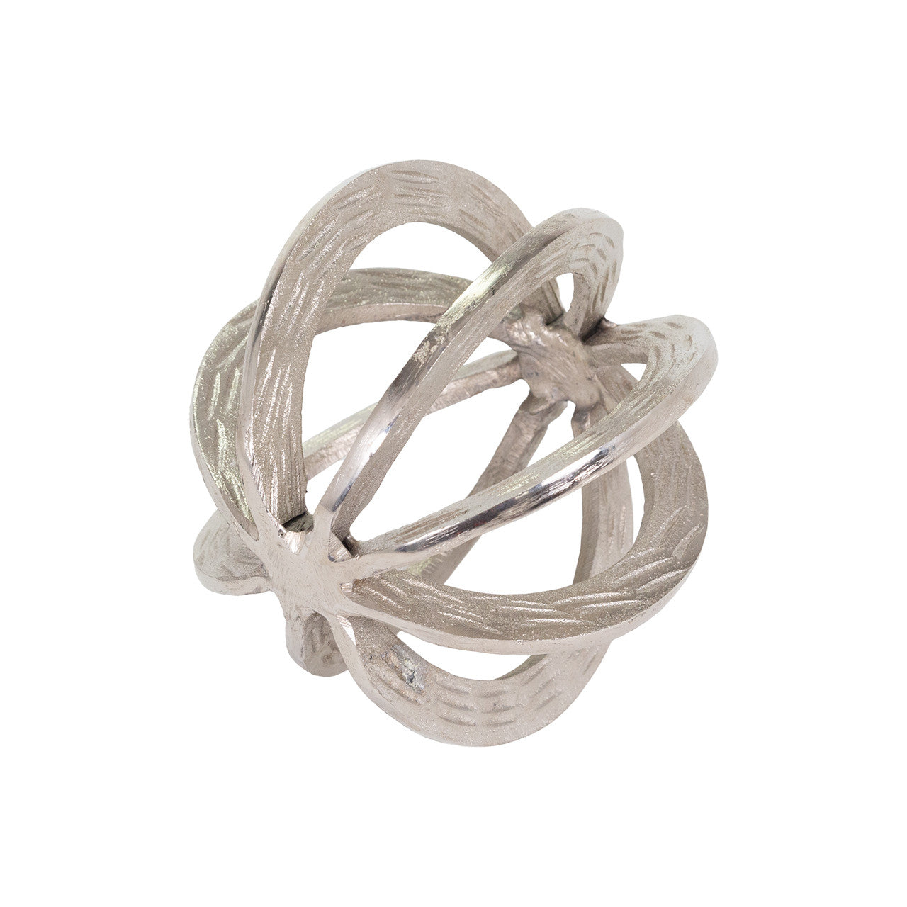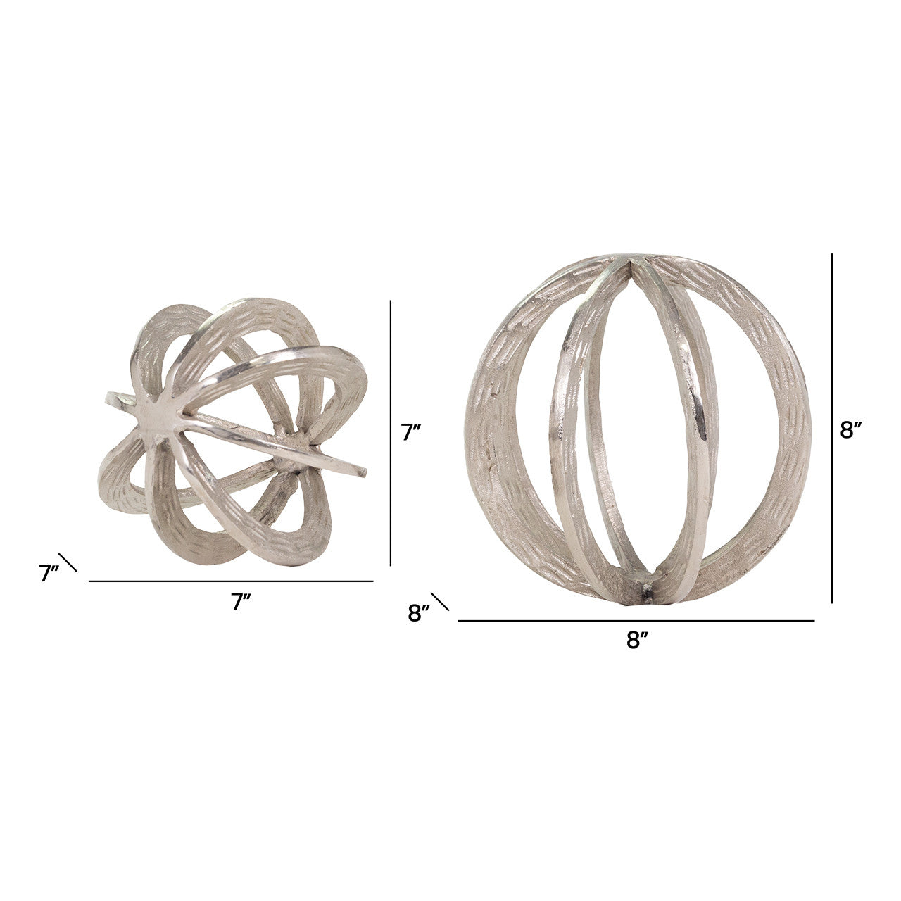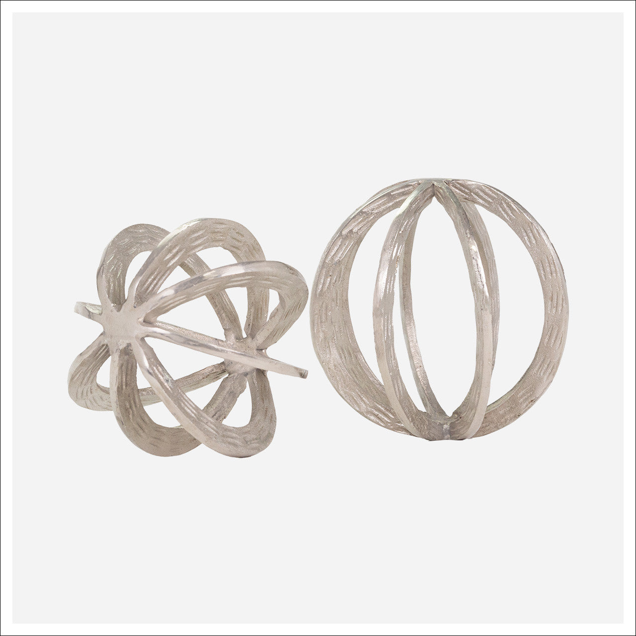 Moderno adorno de mesa set de 2 orbes en color plateado hecho de metal. Miden 20cm.