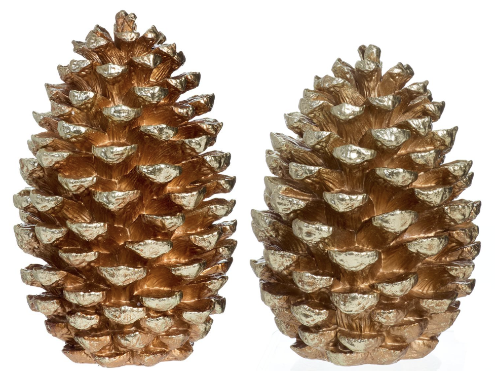 Elegant set of 2 Giant gold pinecone, perfect as table decor. Resin. S: 11.5" H; L: 15.5"