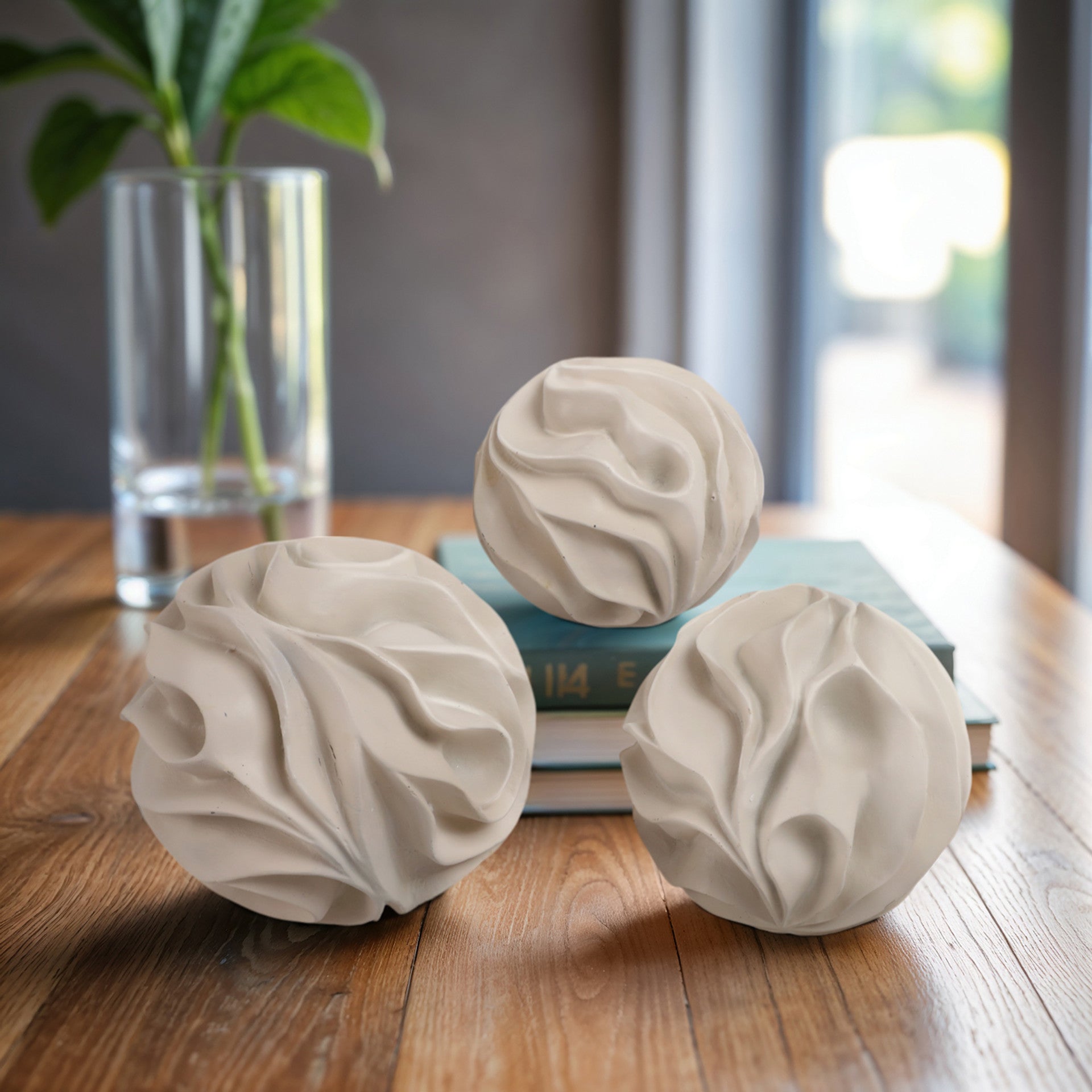 Set de 3 adornos en forma de esfera con curvas. Estilo moderno casual. Resina. 10cm, 13cm, 15cm.