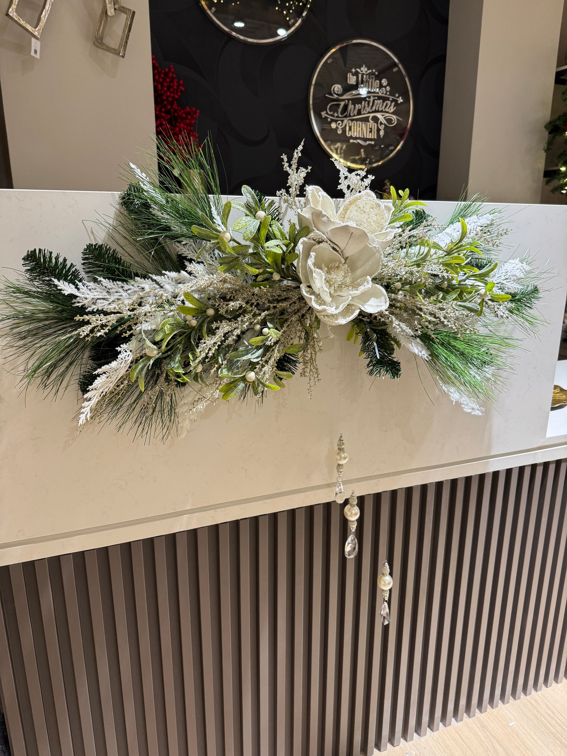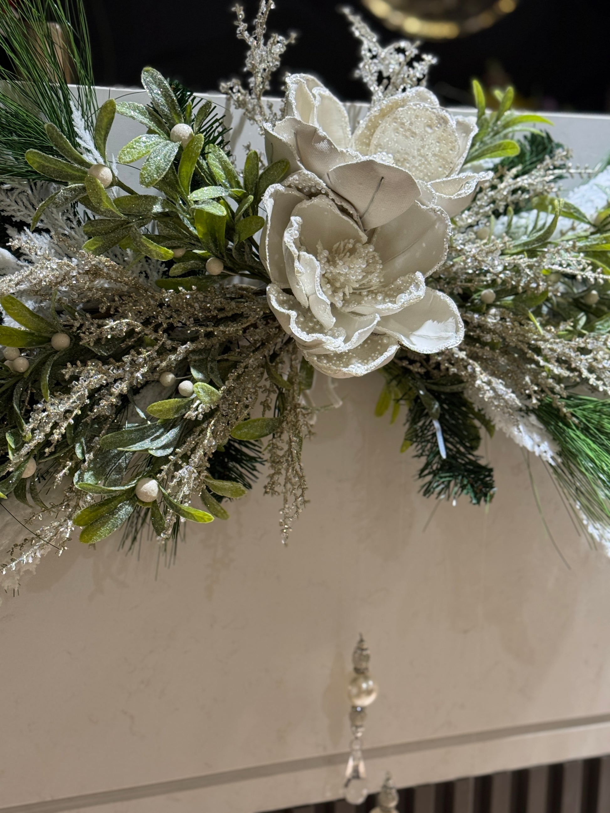 Arreglo elegante decorado con ramas verdes y blancas. Ideal para colgarlo encima de una puerta. Mide 90cm de largo por 42cm de ancho y le cuelgan tres perlas con cristales y llega a medir 86cm de alto. Este adorno se puede usar como centro de mesa al mismo tiempo.