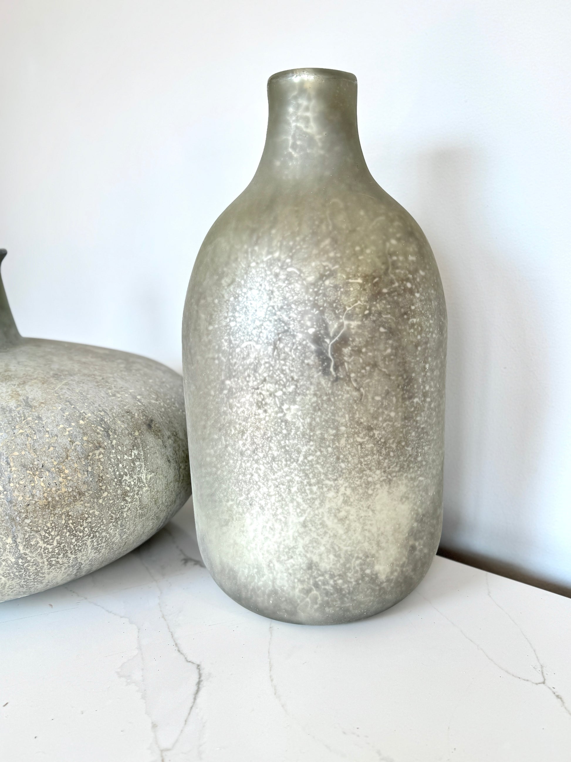 Florero de vidrio con una forma inusual y moderna en tonos grises acero. 50 x 25cm. Haz juego con los demás floreros con el mismo acabado.