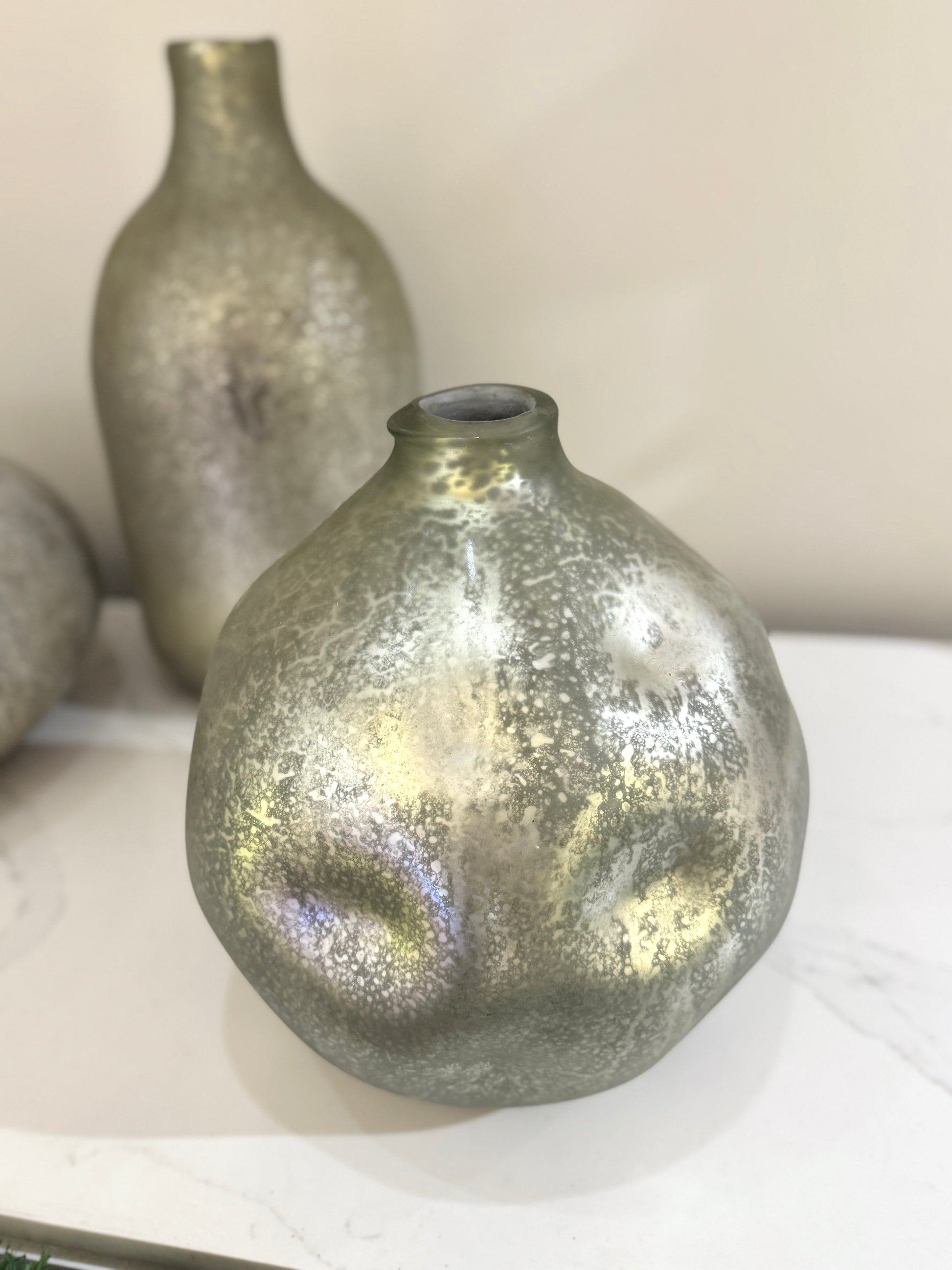 Florero de vidrio con una forma inusual y moderna en tonos grises acero. 30cm. Haz juego con los demás floreros con el mismo acabado.
