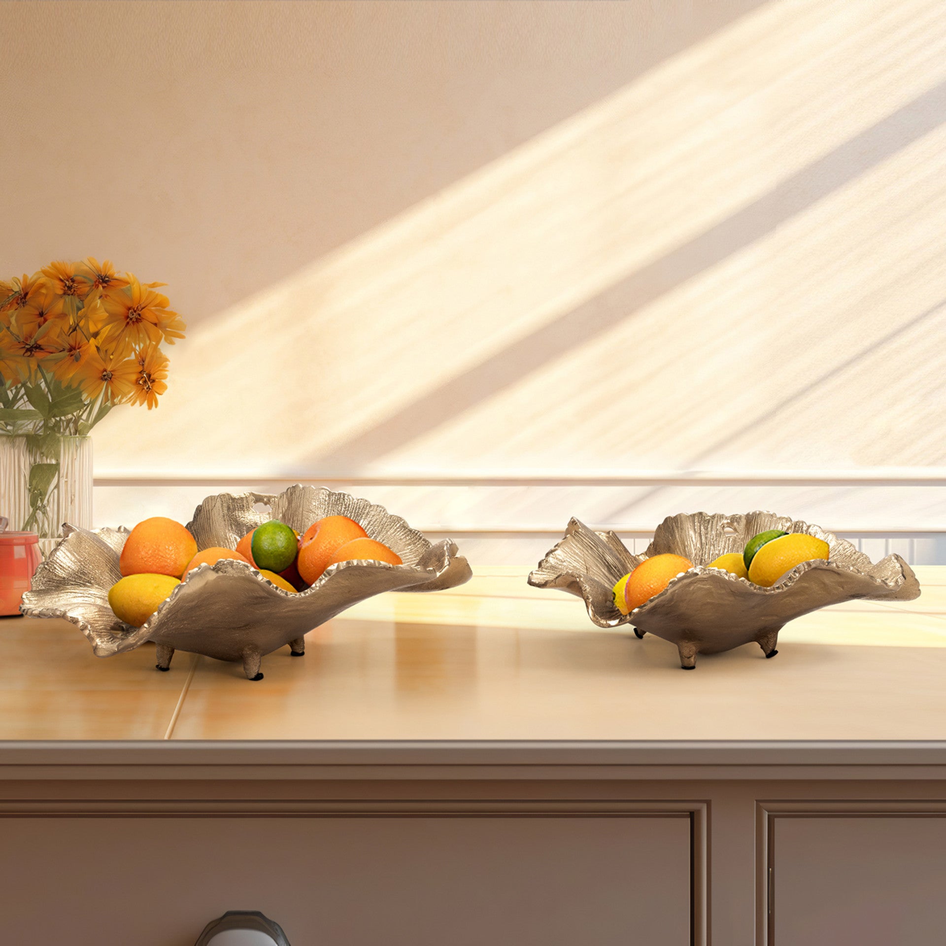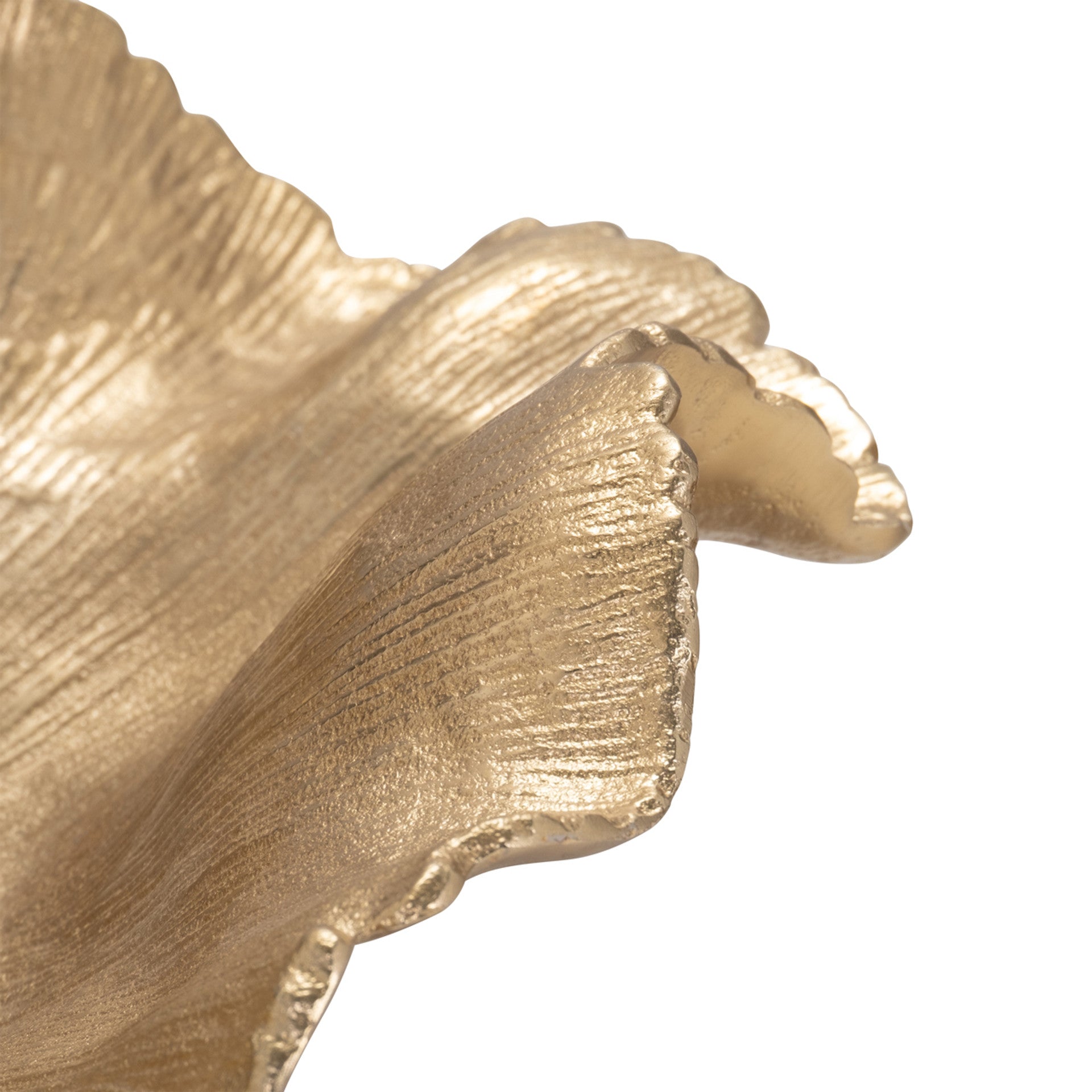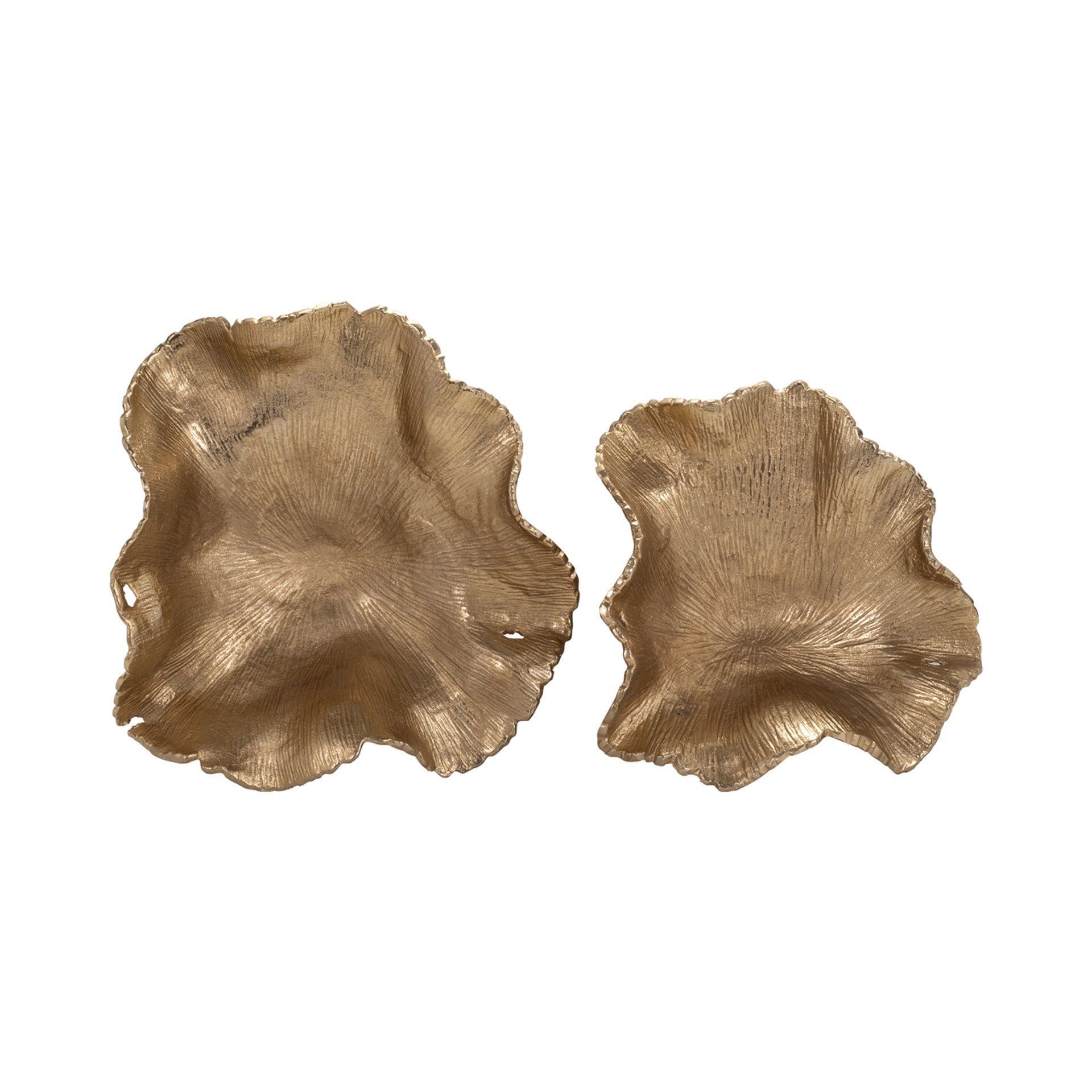 Set de 2 hermosas y modernas charolas de servicio doradas estilo hojas con un acabado elegante. De aluminio. La chica mide 30cm de largo, la grande mide 35.5cm de largo. Aluminio.