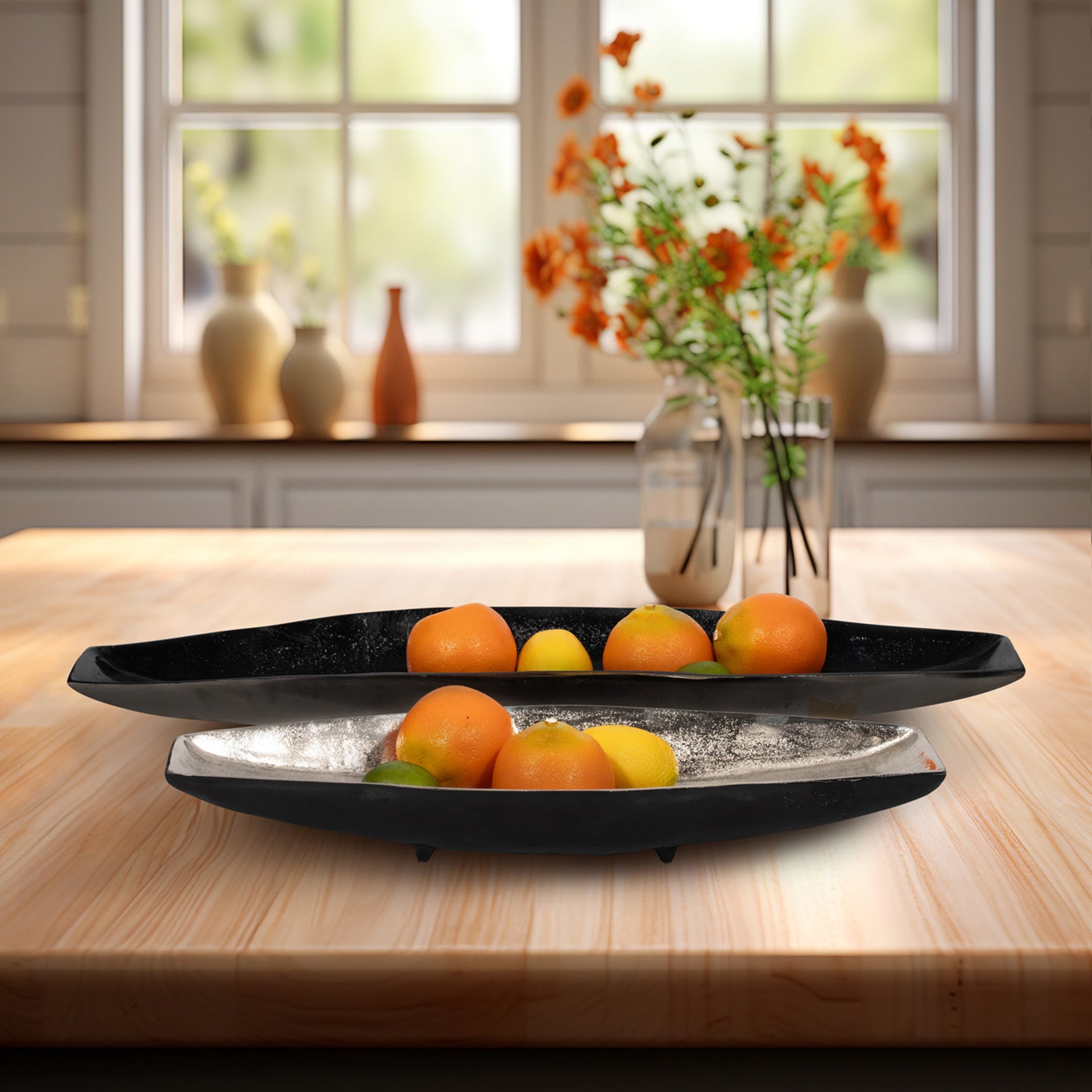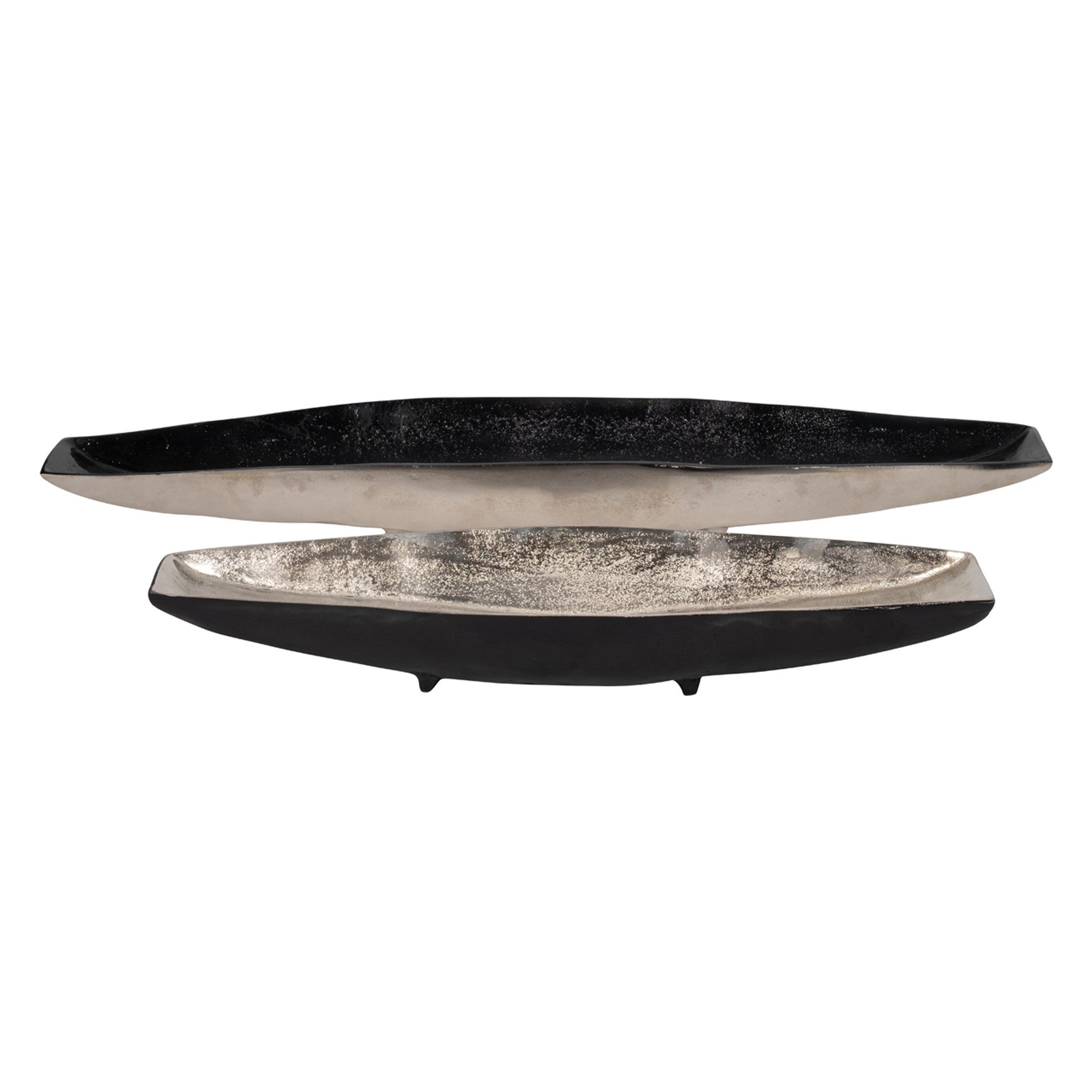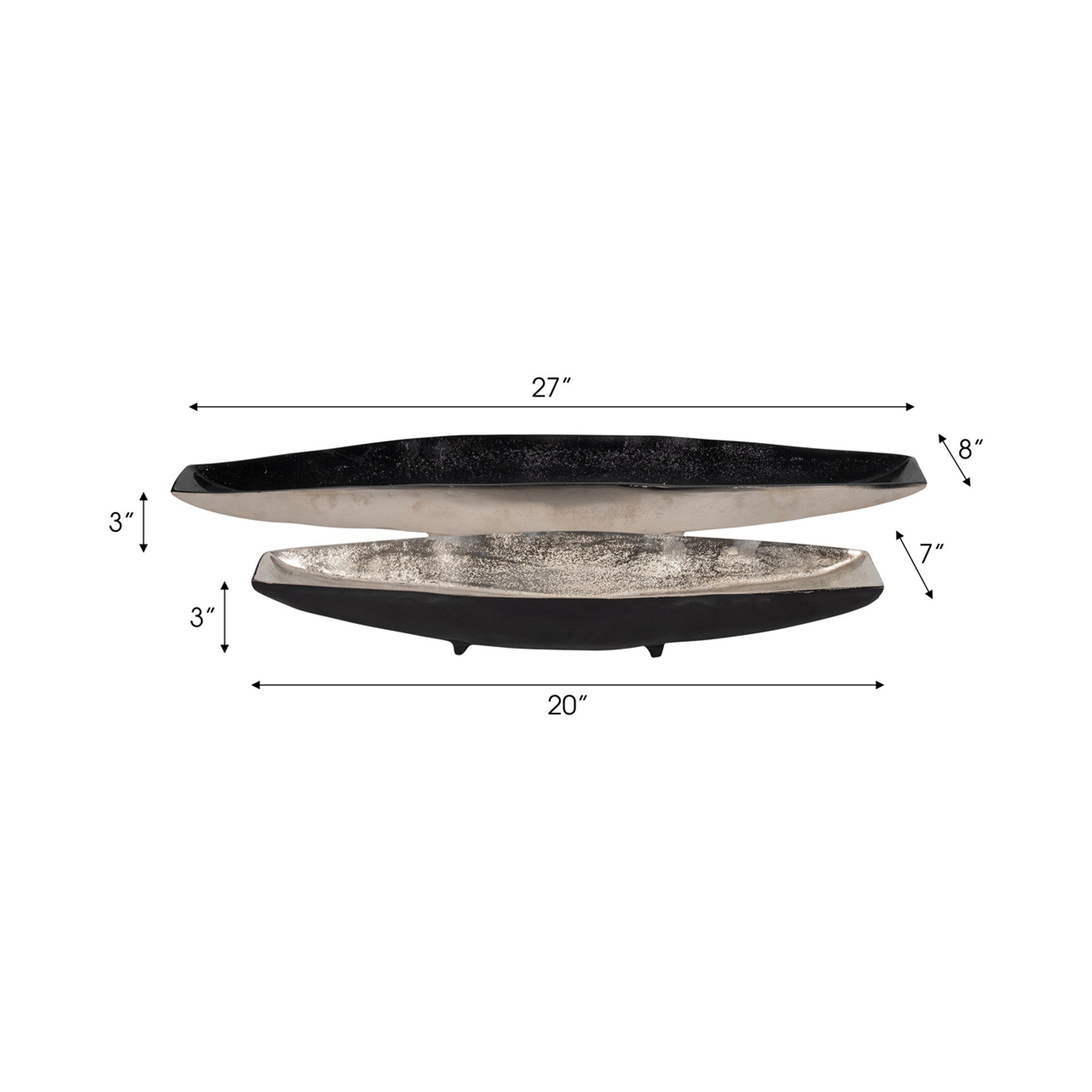 Set de 2 hermosas y modernas charolas de servicio plateadas con negro alargadas con un acabado elegante. De aluminio de alta calidad. La chica mide 51cm de largo, la grande mide 68cm de largo. Aluminio.