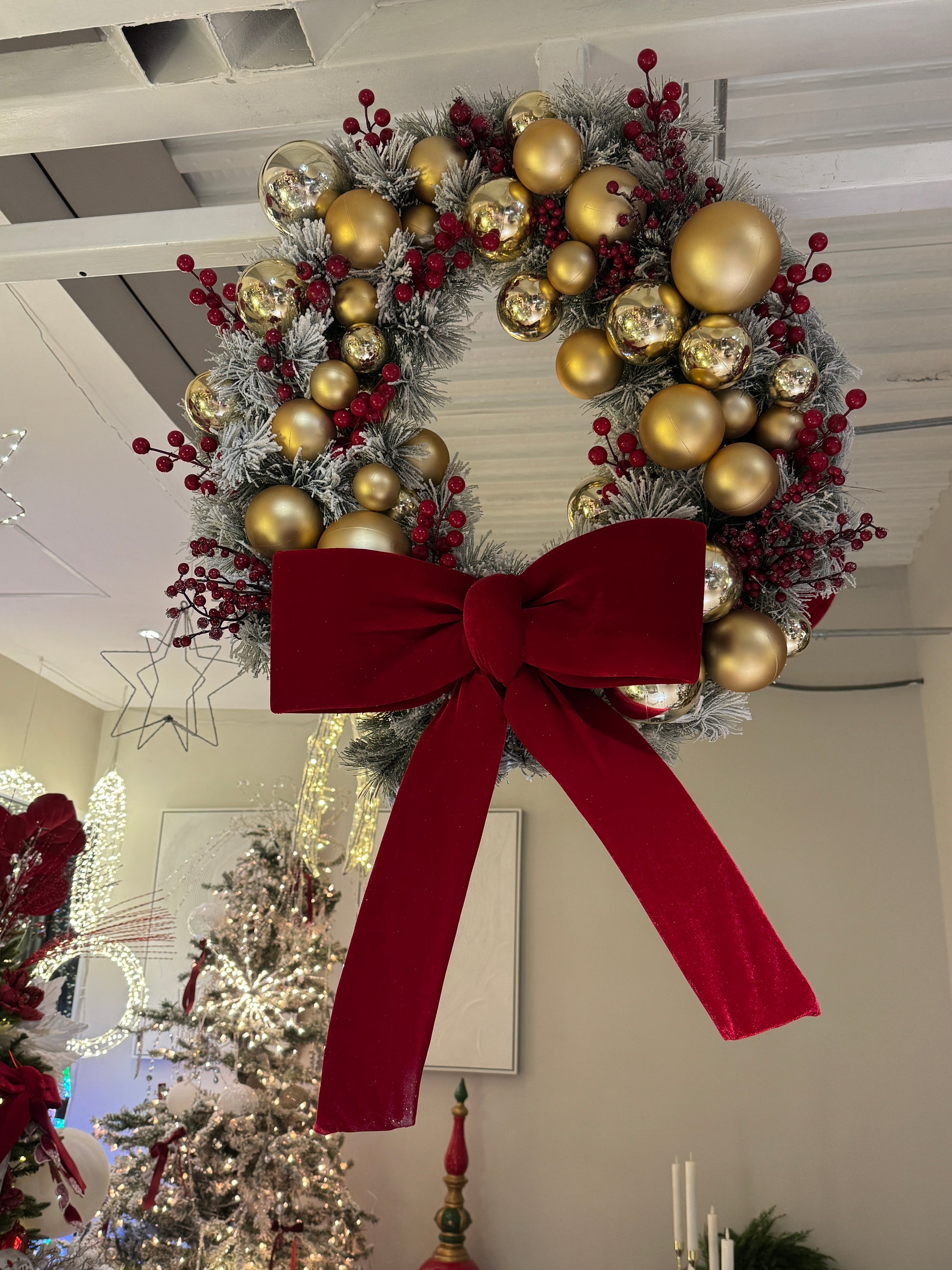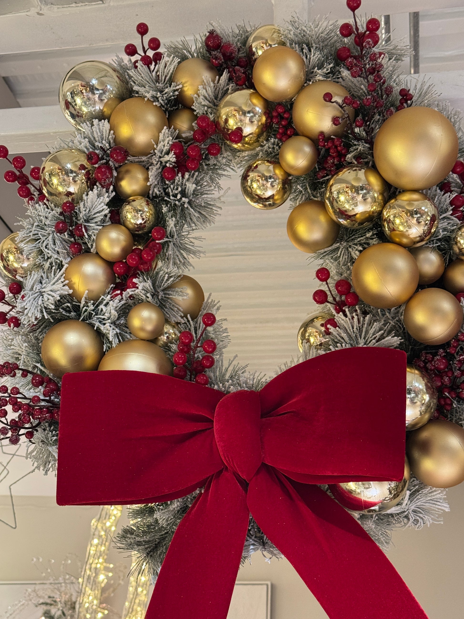 Guirnalda de pino nevada con luces en tonos dorado y rojo. Los adornos que incluyen son exactamente los de la foto. Mide 60cm de diametro y se puede adapar en cualquier espacio. Necesita baterias!
