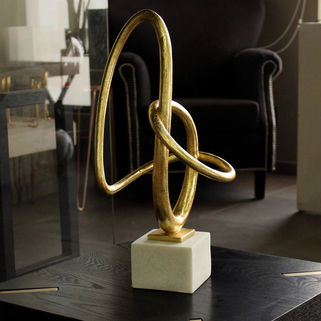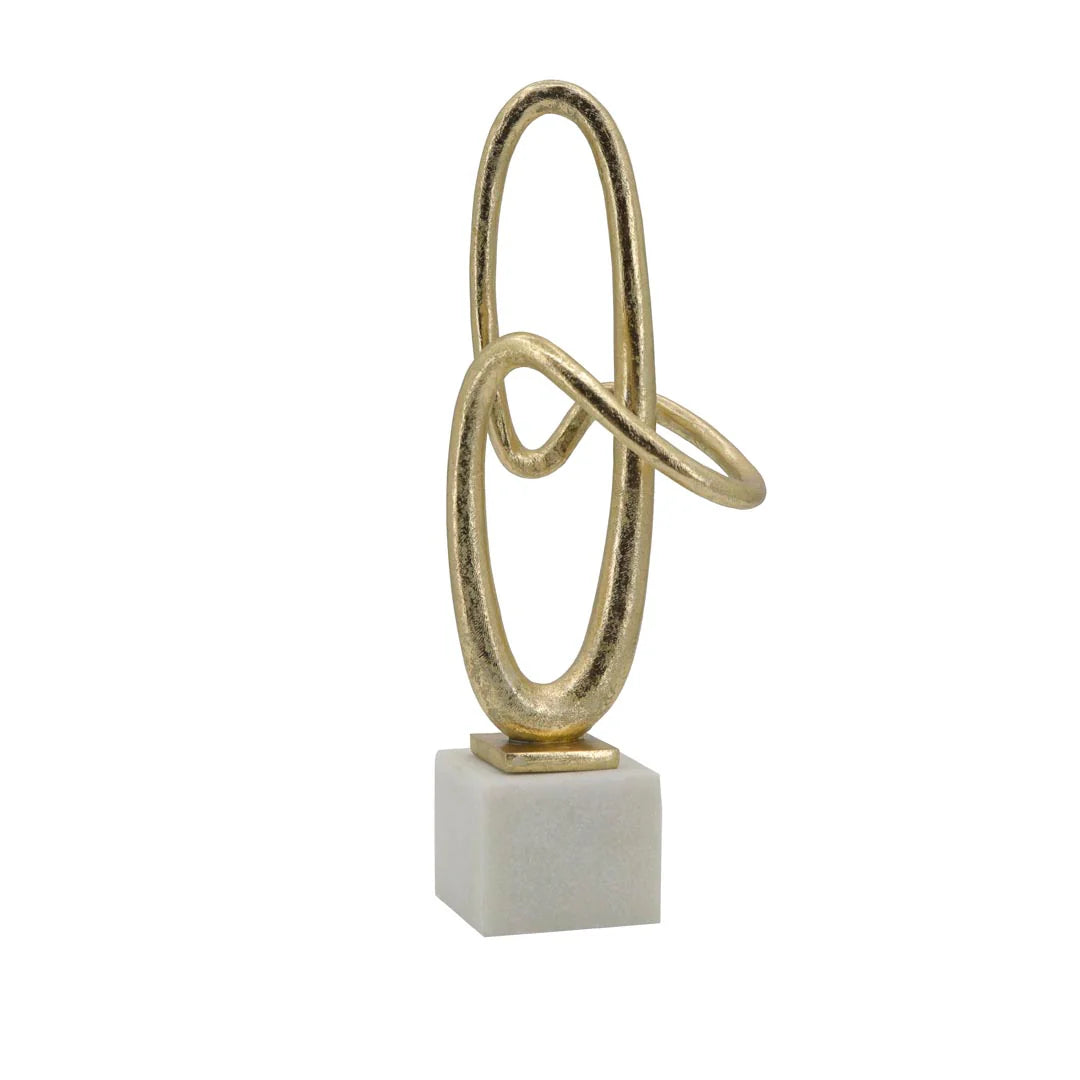 Moderna y contemporánea escultura irregular de resina dorado con la base de mármol. Dos tamaños para hacer juego. El chico 39.5cm de altura y el grande es de 48.5cm de alto.