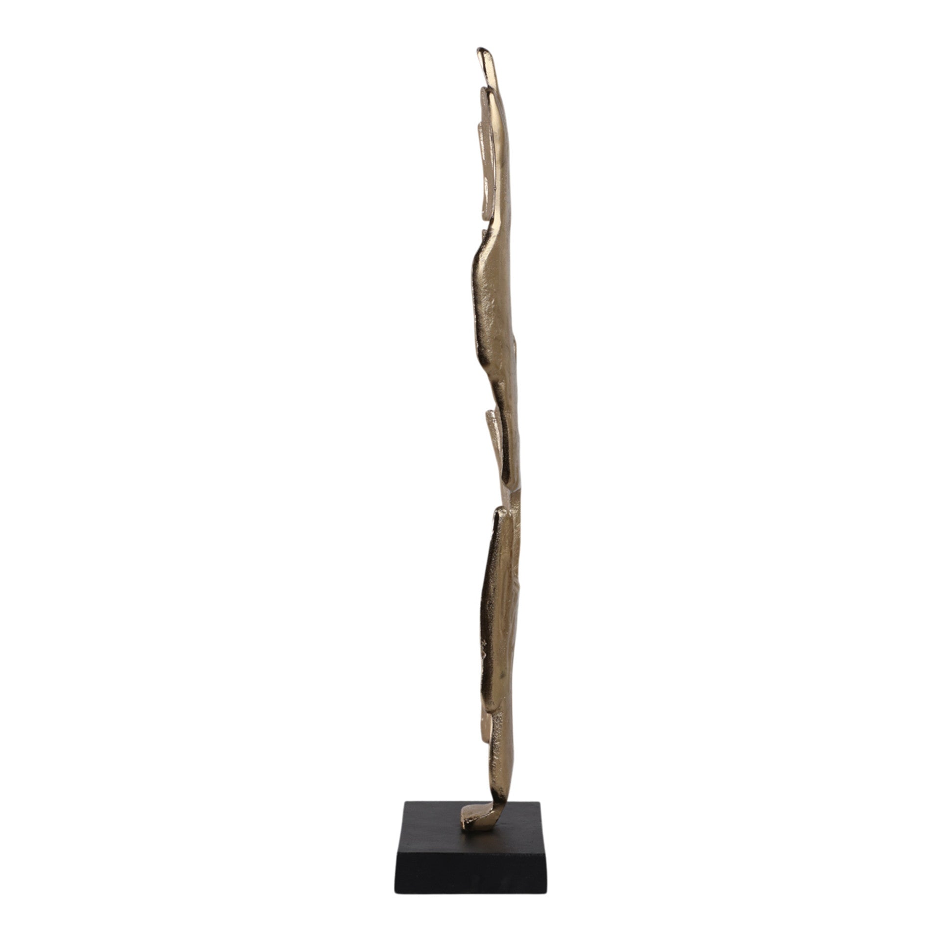 Moderna estatua en color dorado con base negra. Plástico y metal. Grande es de 81cm de alto; 17cm de ancho; 11.5cm de profundo. El chico es de 57cm de alto; 17cm de ancho; 11.5cm de profundo.