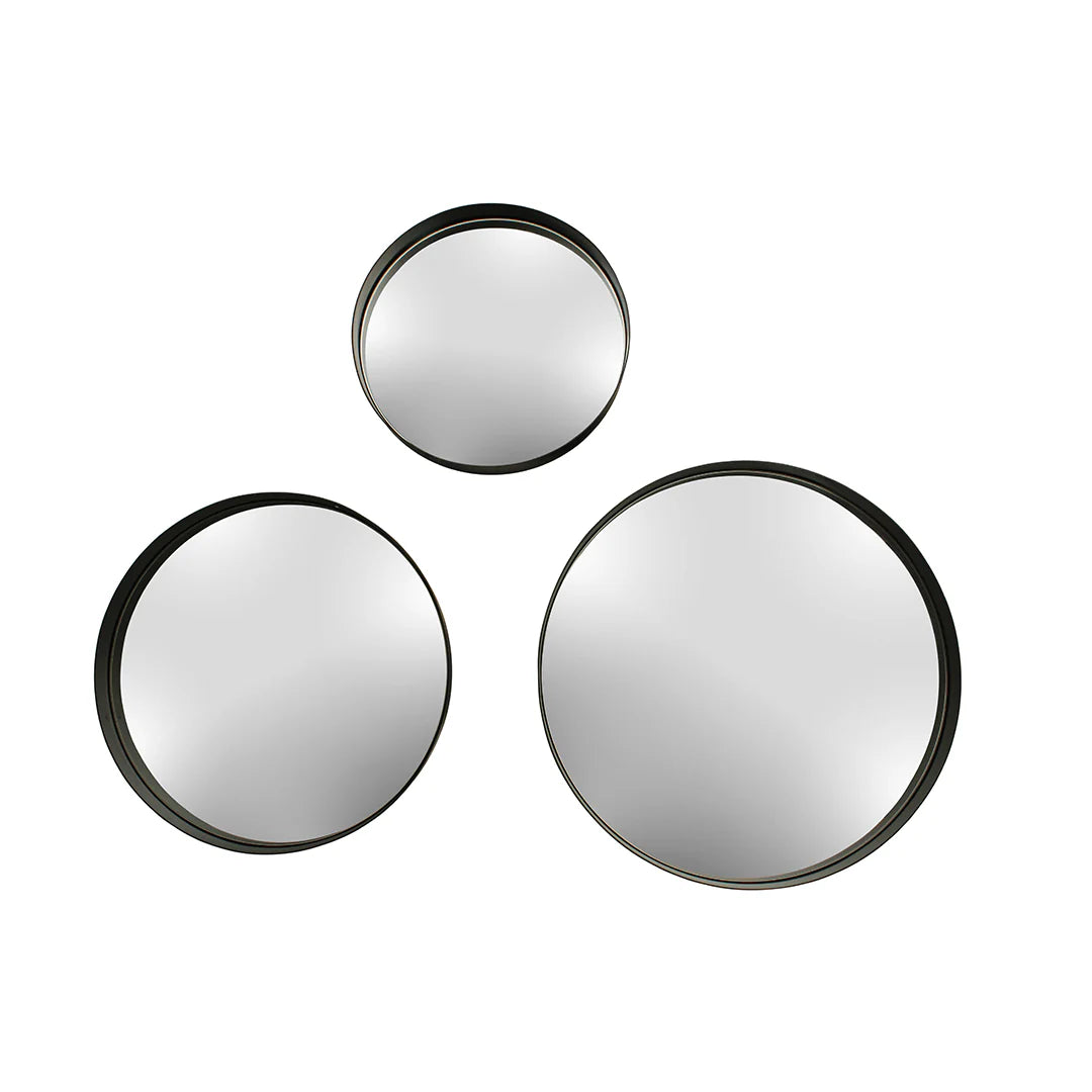 Moderno juego de 3 espejos redondos, de metal. Los diámetros son 41.5cm, 51.5cm y 61.5cm