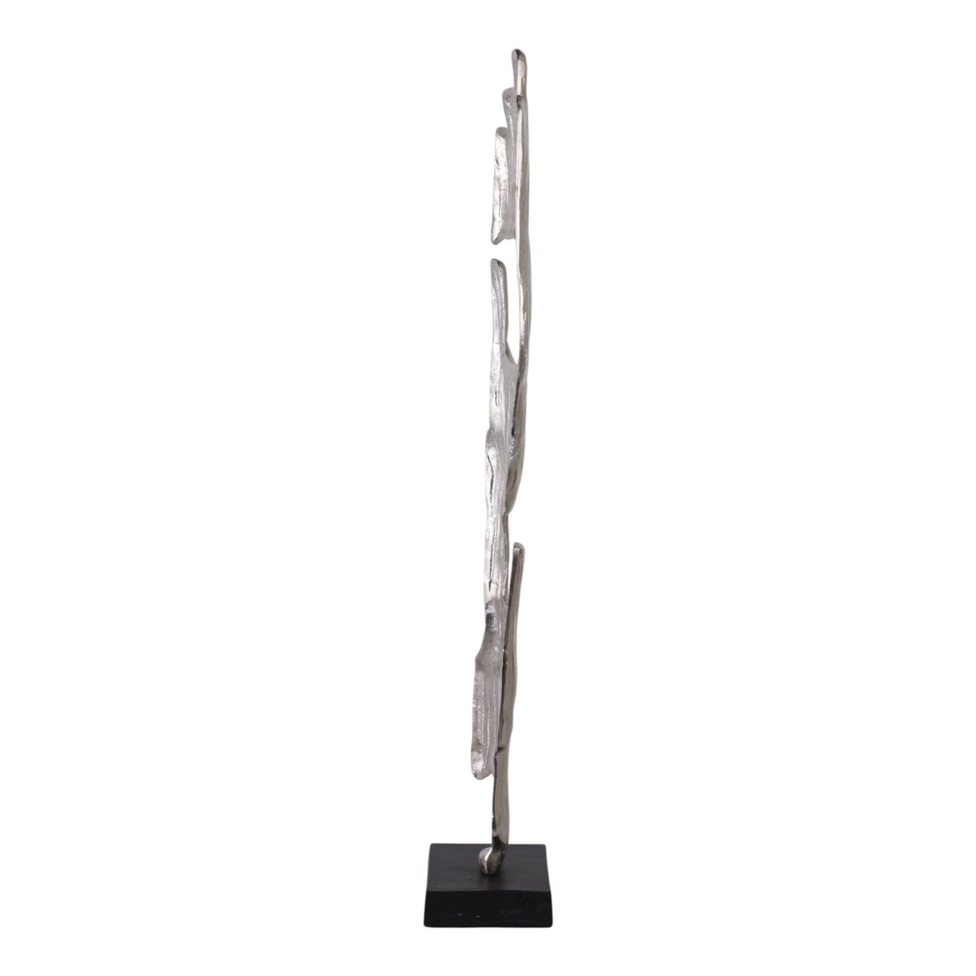 Moderna estatua en color plateado con base negra. Plástico y metal. Grande es de 81cm de alto; 17cm de ancho; 11.5cm de profundo. El chico es de 57cm de alto; 17cm de ancho; 11.5cm de profundo.