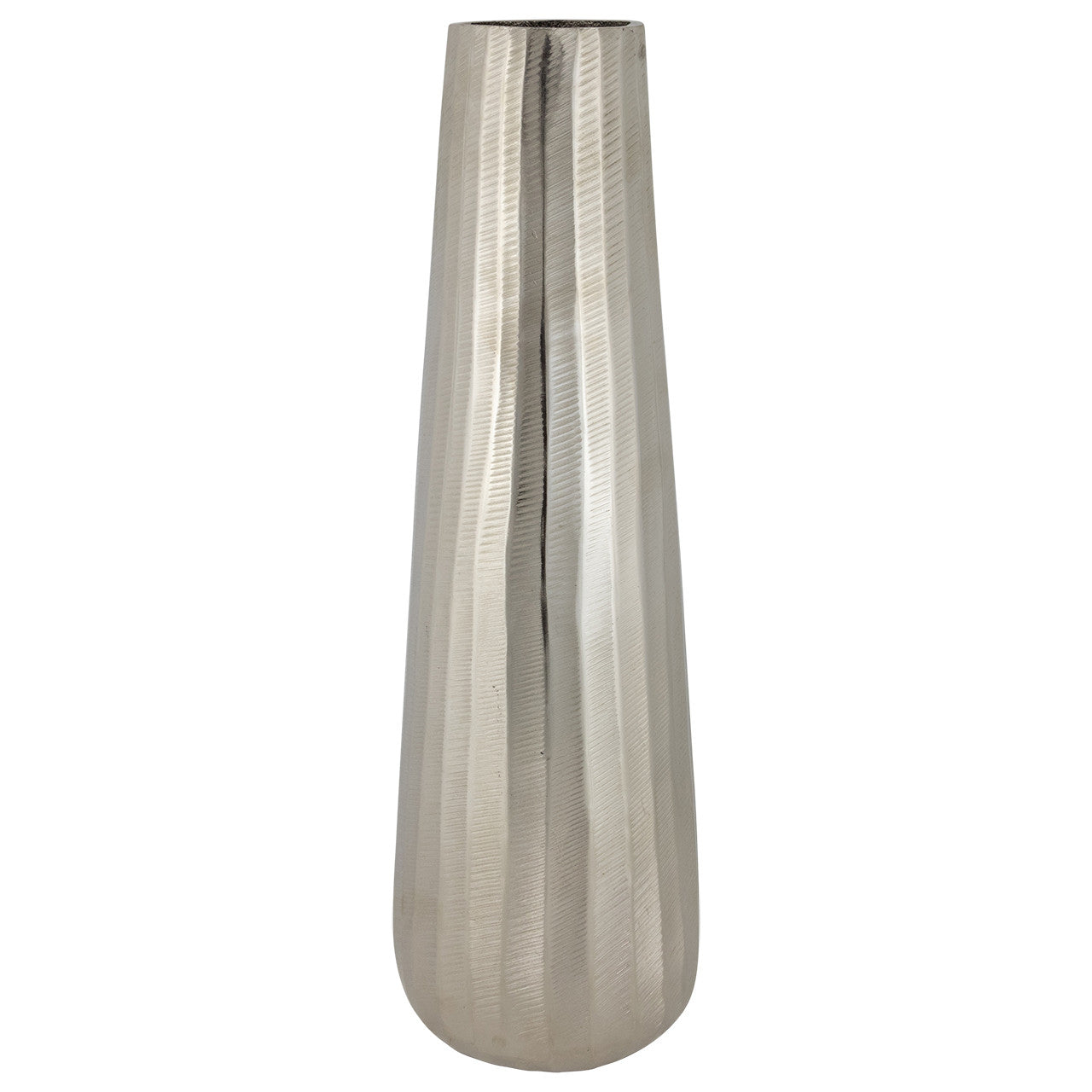 Moderno y casual florero plateado hecho de aluminio de alta calidad con un acabado sofisticado. Mide 71cm de alto.