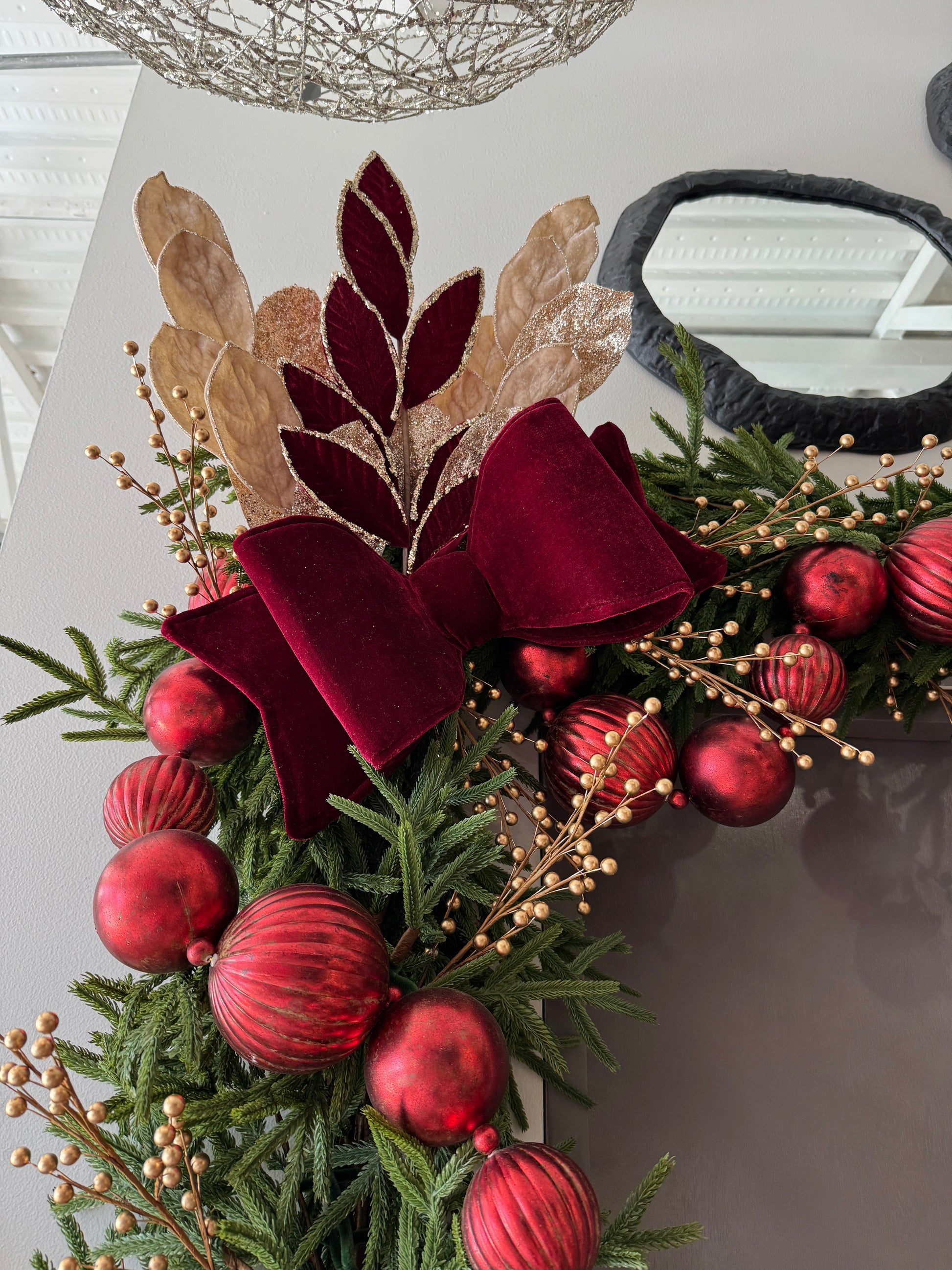 Guirnalda estilo Norfolk, decorada en tonos vino y dorado muy elegante. Esta compuesta por 3 guirnaldas norfolk de 1.80m de largo para armar una sola y los adornos que incluyen son exactamente los de la foto. Pieza Única! Guirnalda se empaca para entrega/envío desarmada, pueden armarla muy sencillamente basándose en las fotos! Las guirnaldas se pueden usar separadas.