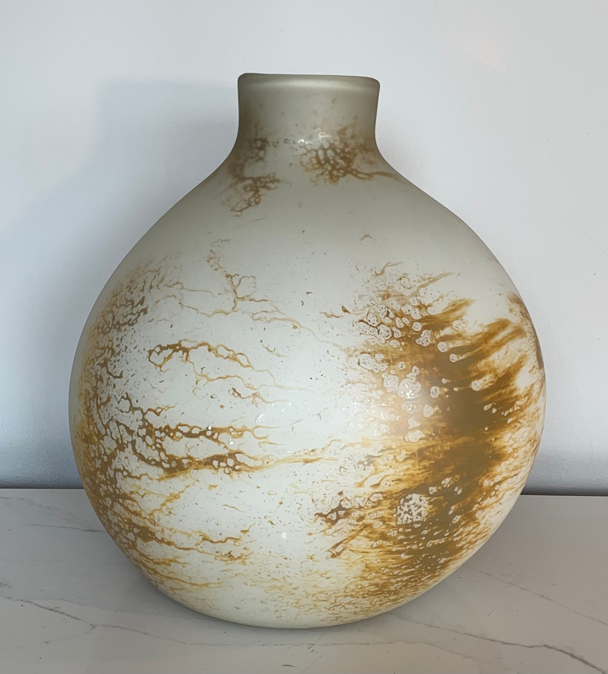 Hermoso florero alto de vidrio blanco con acabado tipo óxido. 50 x 30cm. Haz juego con los demás floreros y jarrones del mismo acabado que se venden por separado.