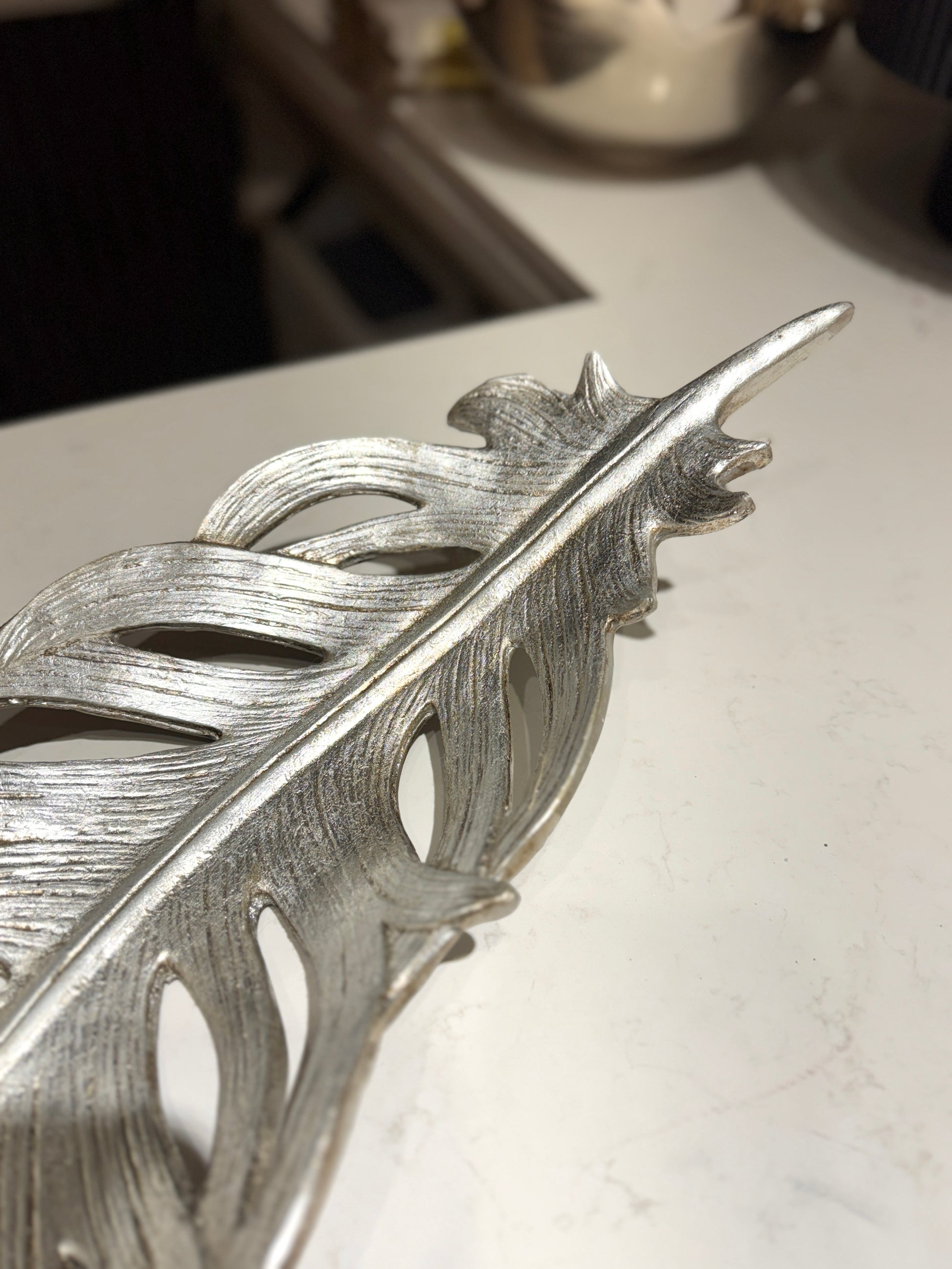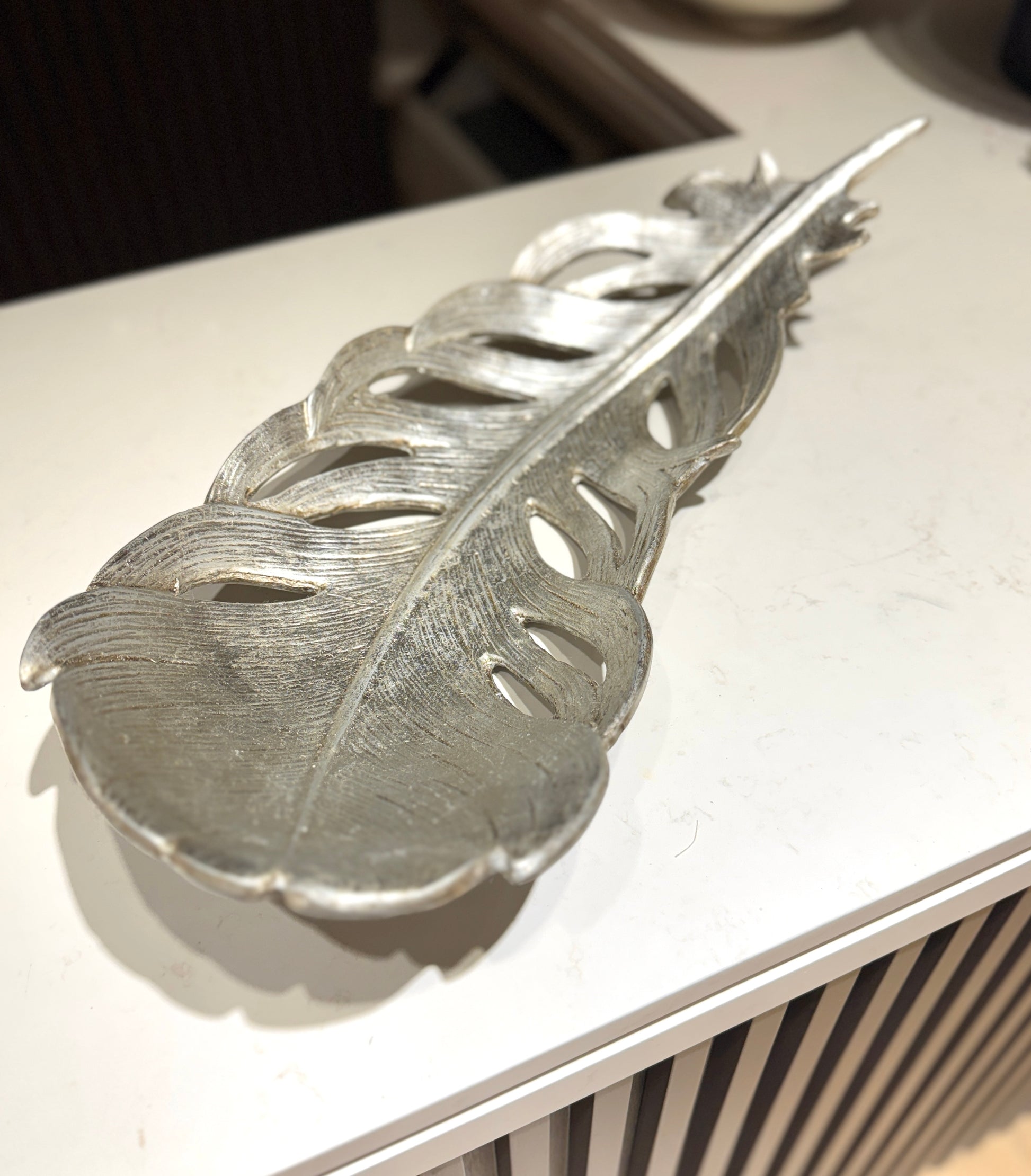 Hermoso platón en forma de hoja plateada. Hecho de resina. 50 cms de largo