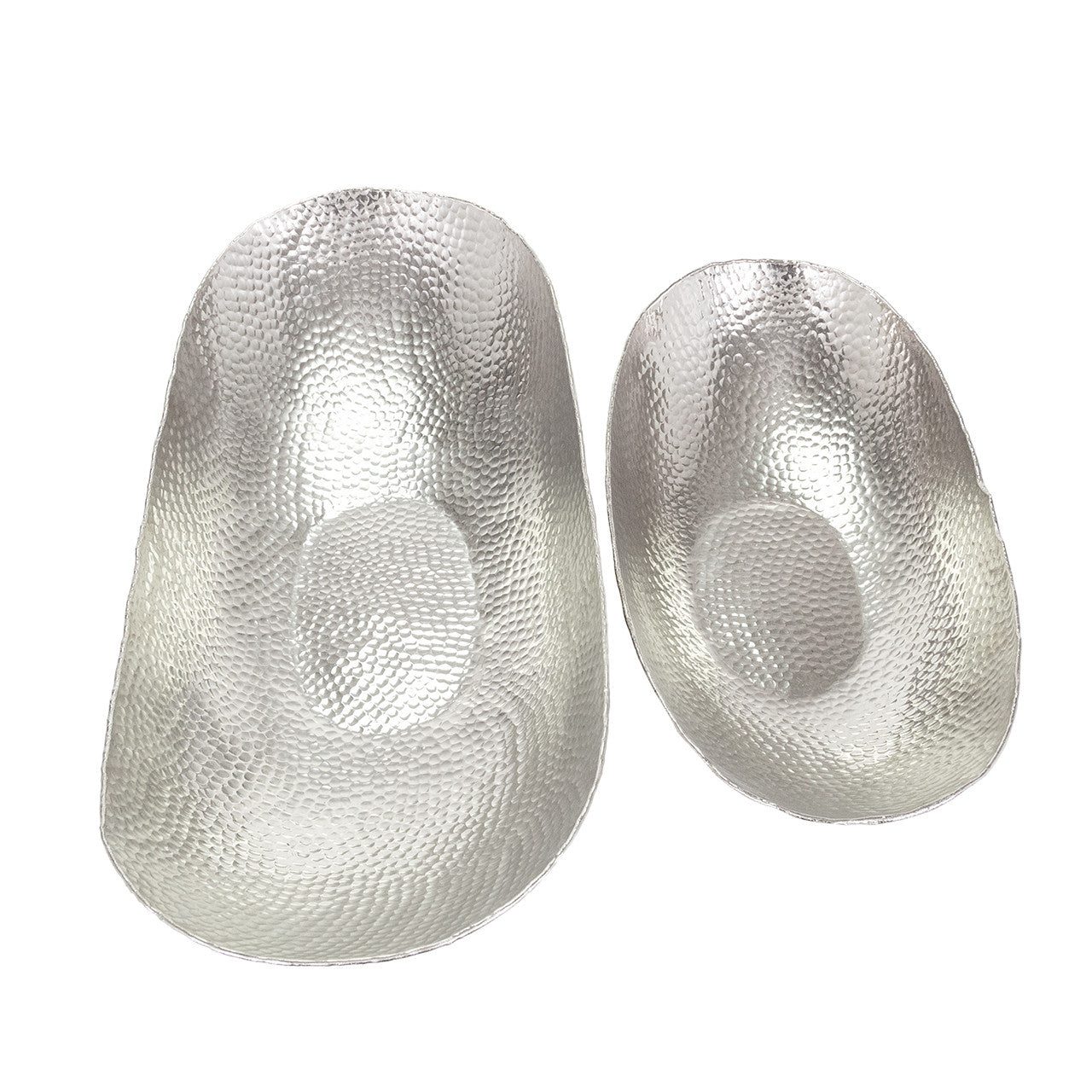 Hermoso set de 2 bowls decorativos de aluminio plateados con acabado martillado.