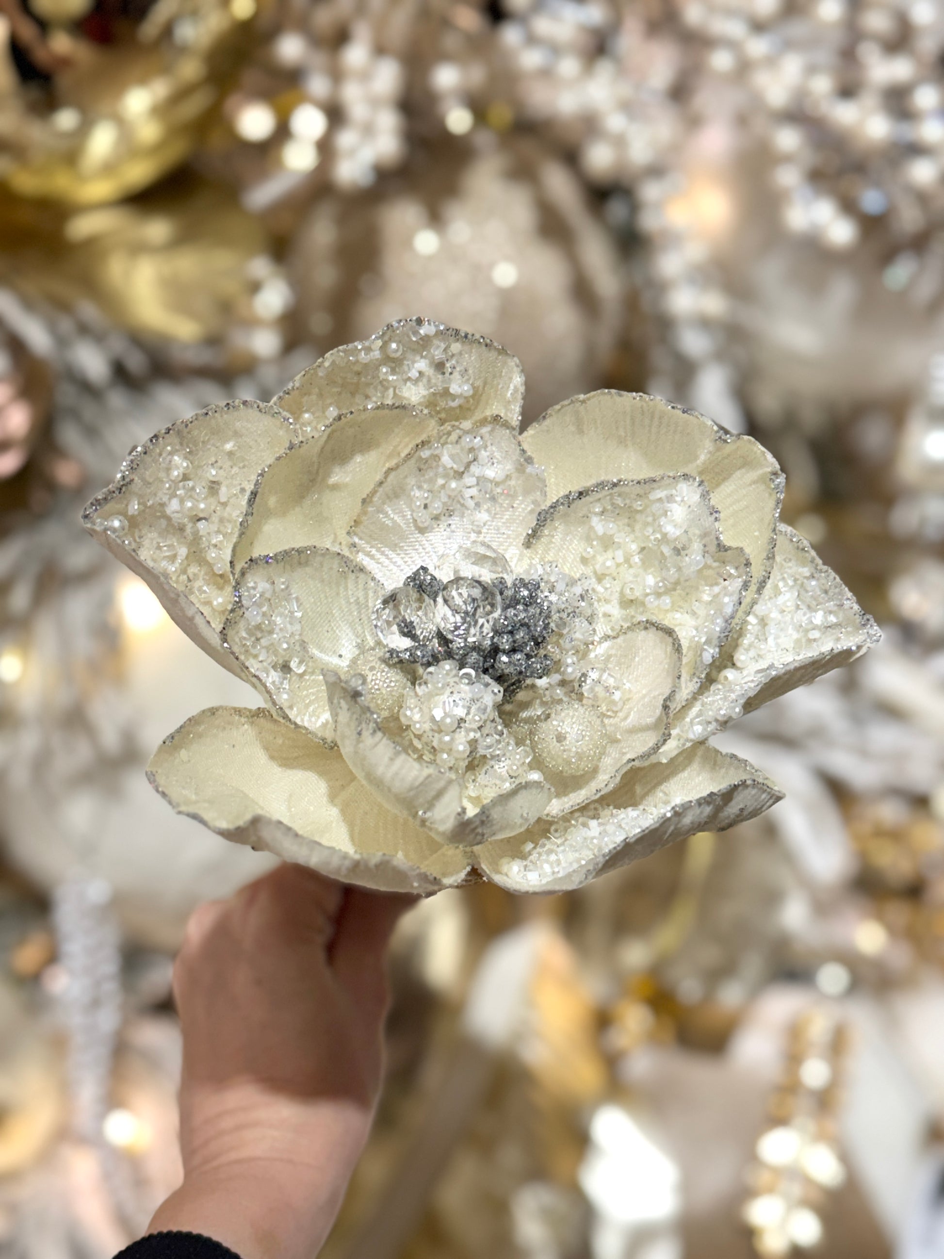 Elegante flor de magnolia color crema con perlas, 50cm de alto. -- Elegante y flor de magnolia blanca de terciopelo con cuentas doradas, 50cm de alto y la flor mide 25cm de diámetro. -- Elegante y muy grande nochebuena de terciopelo con detalles de brillantina dorada. 50cm alto, 45cm diámetro. -- Elegante y muy grande nochebuena blanca de terciopelo y brillantina. 45cm diámetro. -- Elegante nochebuena ivory estilo piel, 60cm de alto. -- Magnolia con perlas 45cm